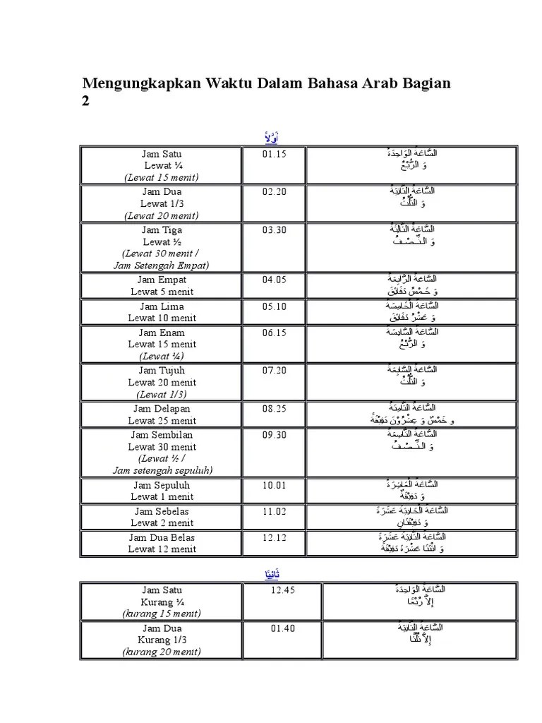· هل تعرف كم الوقت الآن؟ · الساعة السابعة الآن ، كان عليك أن تذهب . Seperempat jam, rub'u saa'ah, ربع ساعة ; 5, siang malam, لَيْلًا وَنَهَارًا . Sepertiga jam (20 menit), tsulutsu saa'ah, ثلث ساعة. Bentuk jamak dari وَقْتٌ adalah أَوْقَاتٌ (auqaatun). Jam 2, السَّاعَةُ الثَّانِيَةُ, assa'atu atssaaniyatu ;